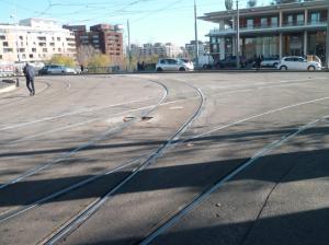 - Aperçu de l’intersection des lignes 1, 3 et 4 de tramways depuis le bout de l’avenue du Pirée à Montpellier, le mercredi 8 janvier 2020. Le premier emplacement du rail à gorge abîmé sur voie 1 est visible au centre de la photo. Copyright : Edouard Paris