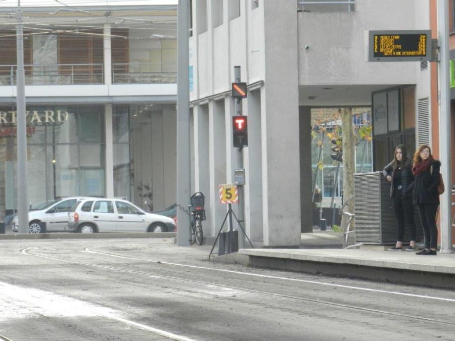 En bout de quai de la station « Moularès (Hôtel de Ville) », un panneau de limitation de vitesse à 5 km/h s’adresse aux rames de la ligne 1 circulant en direction du terminus « Odysseum » et aux rames de la ligne 3 opérant en direction du terminus « Pérols – Etang de l’Or » ou « Lattes Centre ». Photo prise le mardi 7 janvier 2020. Copyright : Anje34