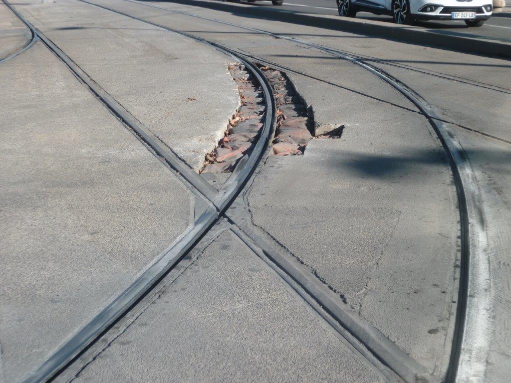 Aperçu du second emplacement où le rail à gorge présente une cassure nette sur voie 1 des lignes 1 et 3 en direction du pont Jean-Zucarelli, le mercredi 8 janvier 2020. Copyright : Edouard Paris