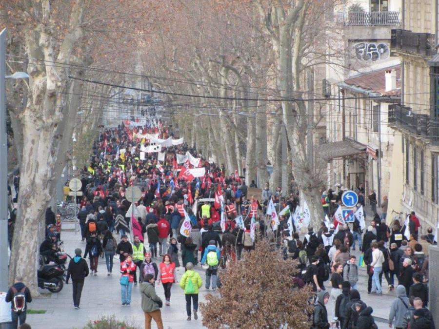Le cortège des manifestants contre le projet de réforme des retraites descend le boulevard Henri-IV à Montpellier, le jeudi 9 janvier 2020 à 16h23. Copyright : Edouard Paris