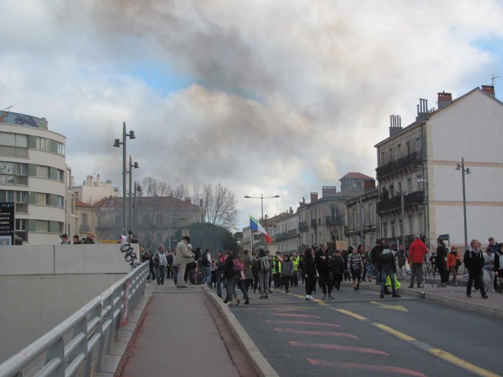 A Montpellier, le jeudi 9 janvier 2019, la tête de cortège de la manifestation interprofessionnelle contre le projet de réforme des retraites est photographiée sur le Pont-de-Sète à 15h21. Copyright : Edouard Paris