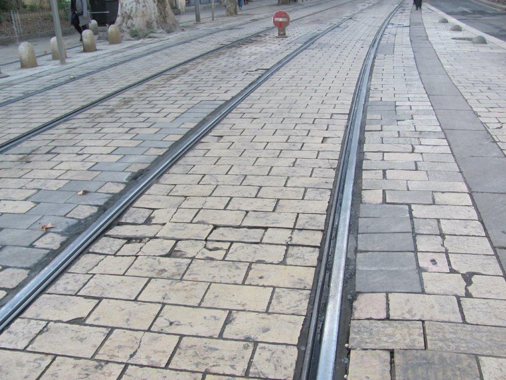 Boulevard Louis-Blanc à Montpellier, aperçu des nouvelles dalles de pierre posées la veille au soir sur la plateforme des lignes 1 et 4 de tramway. Photo prise le jeudi 9 janvier 2020. Copyright : Edouard Paris