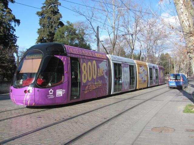 La rame 2048 Citadis 302 Alstom multilignes « Montpellier faculté de Médecine 800 ans », opérant sur la ligne 4 dans le sens b, est photographiée dans le haut du boulevard Henri-IV à Montpellier, le vendredi 10 janvier 2020. Copyright : Edouard Paris