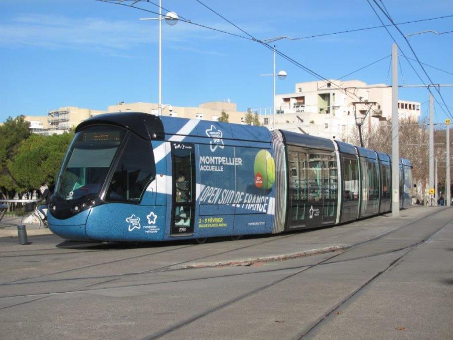 La rame 2098 Citadis 402 Alstom multiligne, opérant sur la ligne 1 et dont les motrices sont habillées aux couleurs de la 10e édition de l’Open Sud de France, est photographiée à l’approche de la station « Moularès (Hôtel de Ville) » commune aux lignes 1 et 3, le samedi 18 janvier 2020. Copyright : Edouard Paris
