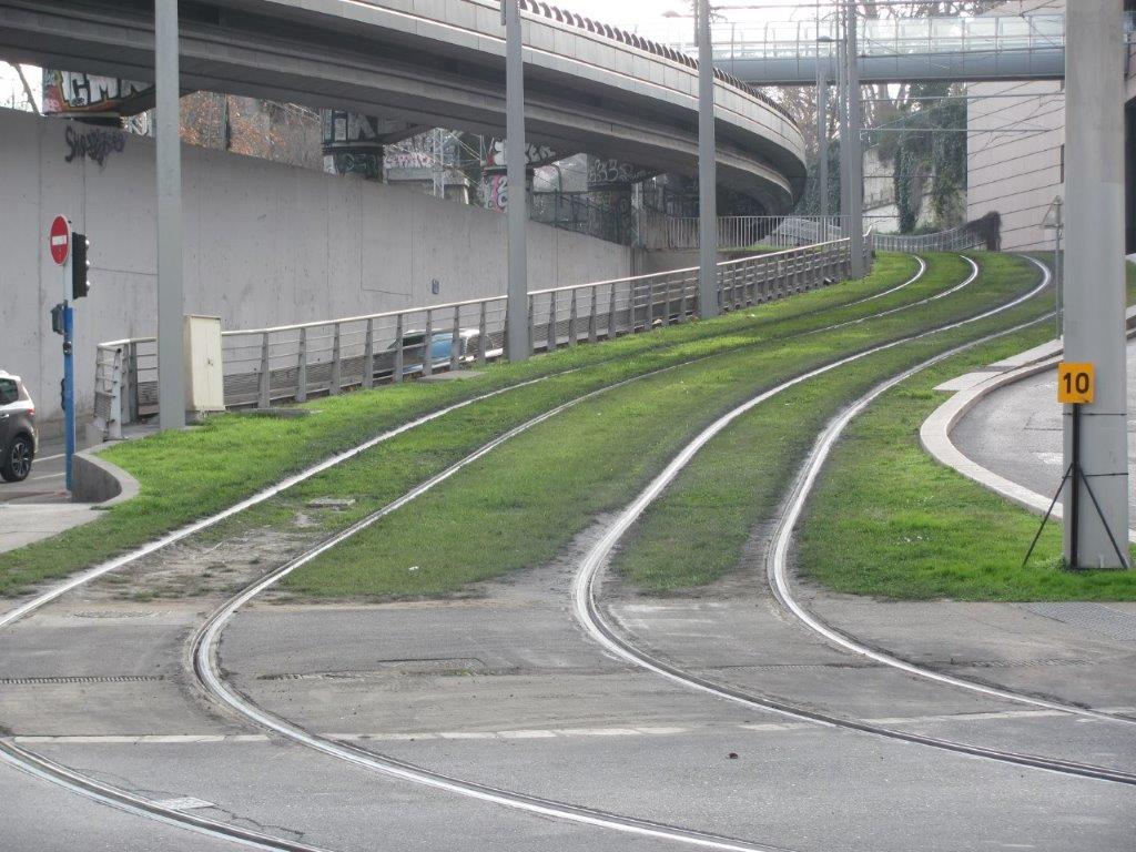 Des travaux d’entretien de la voie 1, celle de droite sur la photo, sont programmés dans la nuit du mardi 21 au mercredi 22 janvier 2020, de 22h jusqu’à la fin du service, au pied du Corum à Montpellier. Photo prise le jeudi 9 janvier 2020. Copyright : Edouard Paris