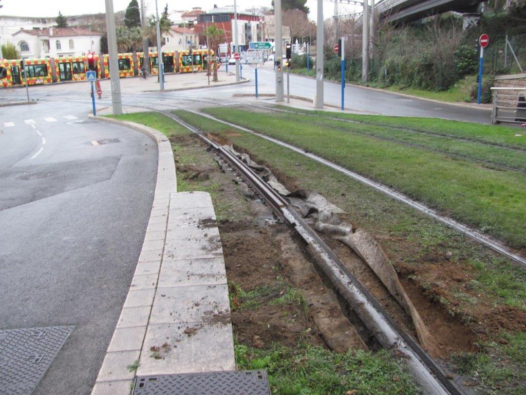 Etat de la voie 1 commune aux lignes 1 et 2, au niveau du bas de l’allée de la Citadelle à Montpellier, photographié le mardi 21 janvier 2020 à 10h37. Copyright : Edouard Paris