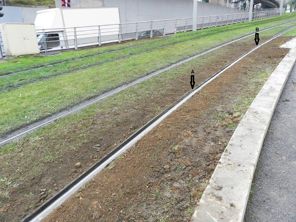 Sur la photo prise le mercredi 22 janvier 2020, les flèches A et B permettent de situer le nouveau coupon de rail à gorge posé sur voie 1 à la hauteur de l’allée de la Citadelle, au pied du Corum à Montpellier. Copyright : Anje34