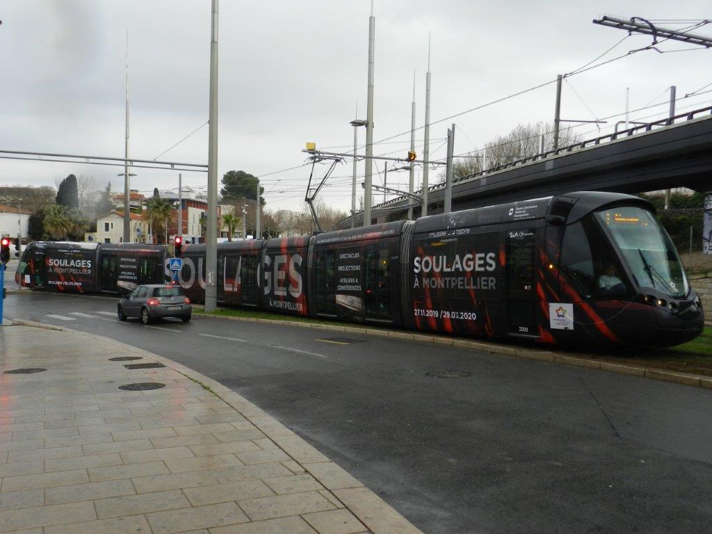 La rame 2099 Citadis 402 Alstom multiligne « Soulages à Montpellier » du 27/11/2019 au 29/03/2020″, opérant sur la ligne 1 en direction du terminus « Odysseum », est photographiée au moment où elle va rouler à 10 km/h maximum sur le nouveau coupon de rail à gorge posé le jour précédent. Photo prise le mercredi 22 janvier 2020. Copyright : Anje34