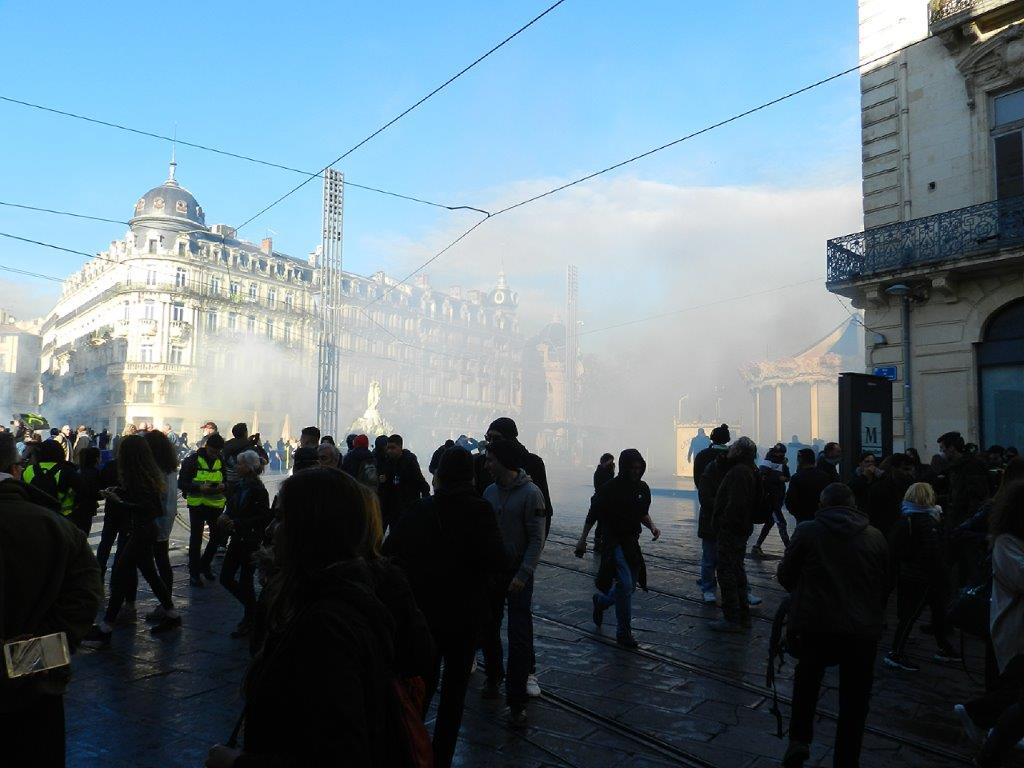 A 15h30, le samedi 1er février 2020, l’emblématique place de la Comédie de Montpellier est recouverte par les fumées blanches des gaz lacrymogènes lancés par les forces de l’ordre en direction des manifestants. Copyright : Anje34