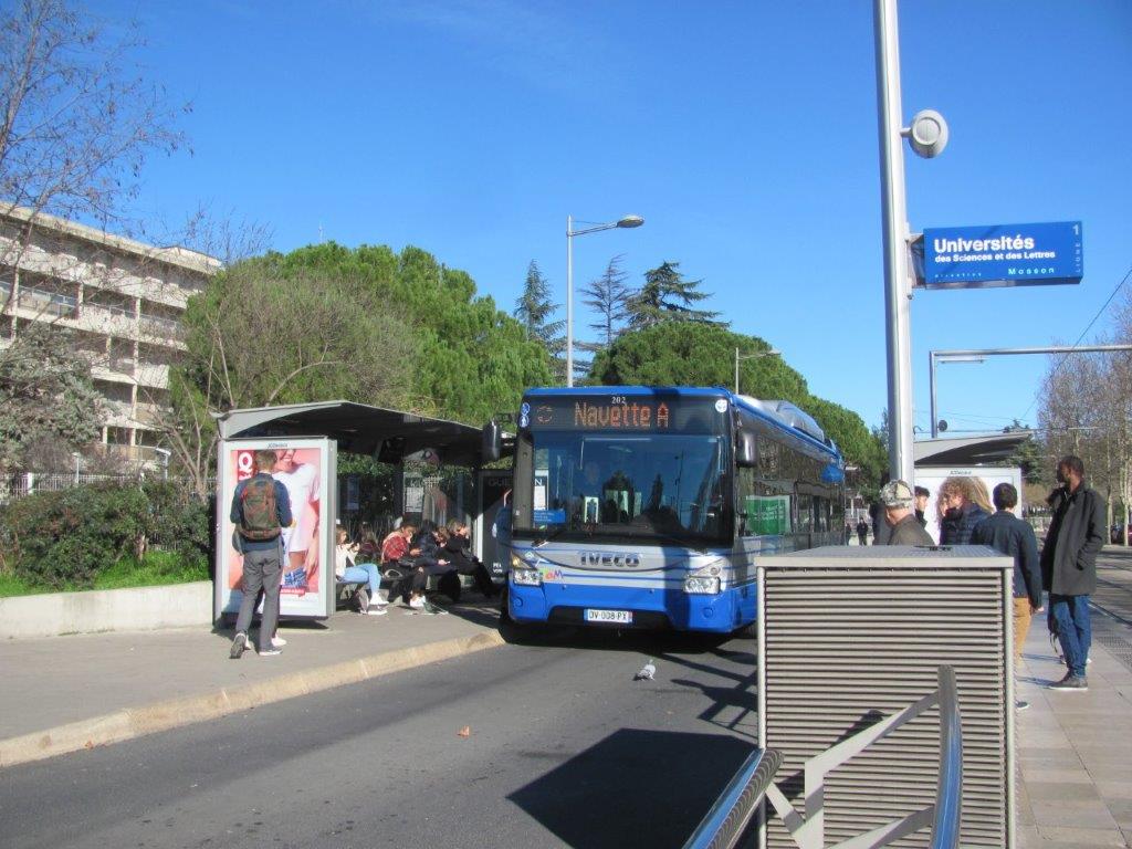 Du lundi 6 janvier 2020 au mercredi 18 décembre 2024, le terminus unique de La Navette A et B est situé à la hauteur de la station « Universités des Sciences & Lettres » de la ligne 1 de tramway. Photo prise le mercredi 5 février 2020. Copyright : Edouard Paris