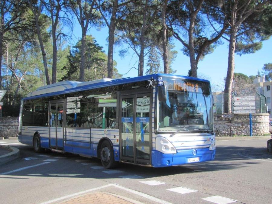 Un bus, opérant sur La Navette sens A en direction du nouveau terminus « Universités des Sciences & Lettres » via l’avenue du Professeur Emile-Jeanbrau, débouche de l’avenue du Vert-Bois sur le rond-point de la route de Mende à Montpellier, le mercredi 5 février 2020. Copyright : Edouard Paris