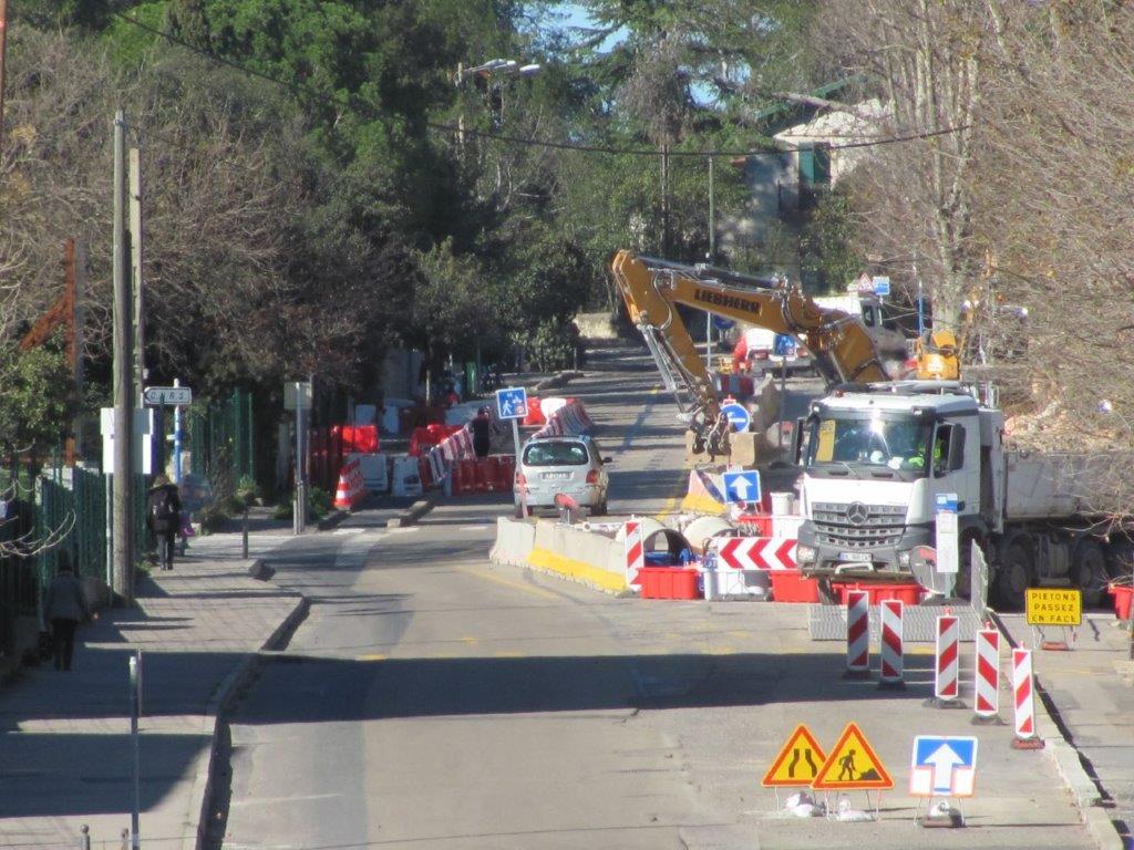 Aperçu d’un chantier en lien avec la réalisation de la ligne 5 de tramway sur la section nord de la route de Mende à Montpellier à la hauteur de l’entrée de CNRS, le mercredi 5 février 2020. Copyright : Edouard Paris