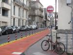 Moins de deux mois après leur retour et forts de leur expérience acquise au Danemark, une voie cyclable de 320 mètres de long de couleur orange, qui ne passe pas inaperçue, a été ouverte rue Gerhardt et sur une petite partie de la rue Doria à Montpellier, entre la rue du Faubourg Saint-Jaumes et l’avenue d’Assas. Le coût de cette réalisation s’élève à 101 000 €, études comprises. Sur cette voie cyclable, les cyclistes sont censés circuler dans un seul sens soit de la rue du Faubourg Saint-Jaumes vers l’avenue d’Assas mais en réalité force et de constater que des cyclistes l’utilisent à contresens alors que la largeur de la voie cyclable en question n’est pas adaptée au croisement en toute sécurité de deux cyclistes. Par ailleurs, si un panneau indique bien la fin de la voie cyclable rue Doria, il manque clairement un panneau Stop ou un panneau Céder le passage avec un marquage au sol qui doit aller de pair s’adressant aux cyclistes. En effet, il n’est pas rare de voir un(e) cycliste déboucher de la rue Doria sur l’avenue d’Assas en venant de la rue Gerhardt sans prendre aucune précaution. Certain(e)s jouent à la roulette russe et un jour ça se terminera très mal à cause d’un bureau d’étude qui ne s’est pas complètement préoccupé de la sûreté des cyclistes à cet endroit là bien qu’il ait certainement touché une somme rondelette dans l’histoire.