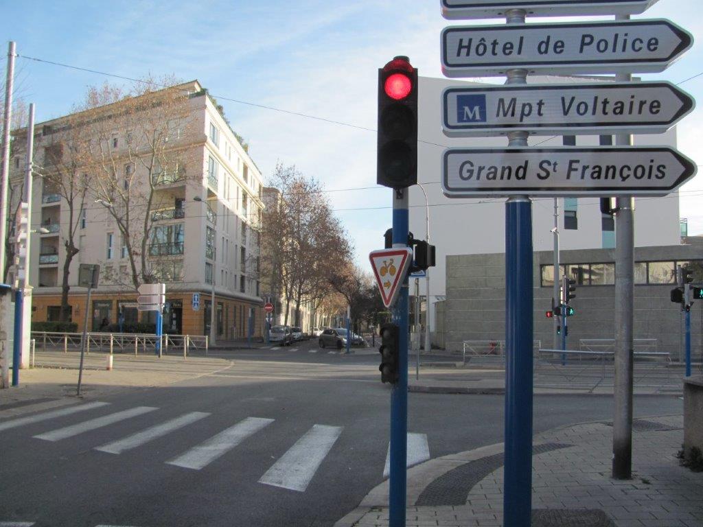 A Montpellier, panneau tourne-à-droite vélo grand format fixé entre les petits et grands feux tricolores photographié au carrefour du chemin de Moularès et de la rue du Comté de Melgueil, le samedi 18 janvier 2020. Copyright : Edouard Paris