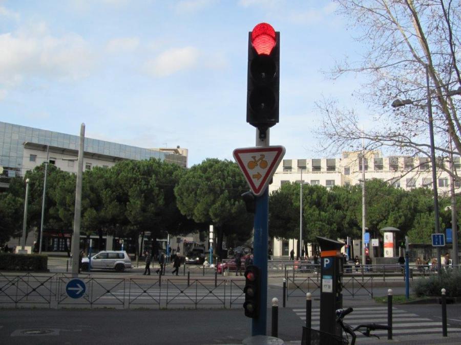 A Montpellier, panneau tourne-à-droite vélo grand format fixé en hauteur photographié dans le quartier Port-Marianne au carrefour de la rue de Messine et de la rue de Famagouste, le vendredi 7 février 2020. Copyright : Edouard Paris