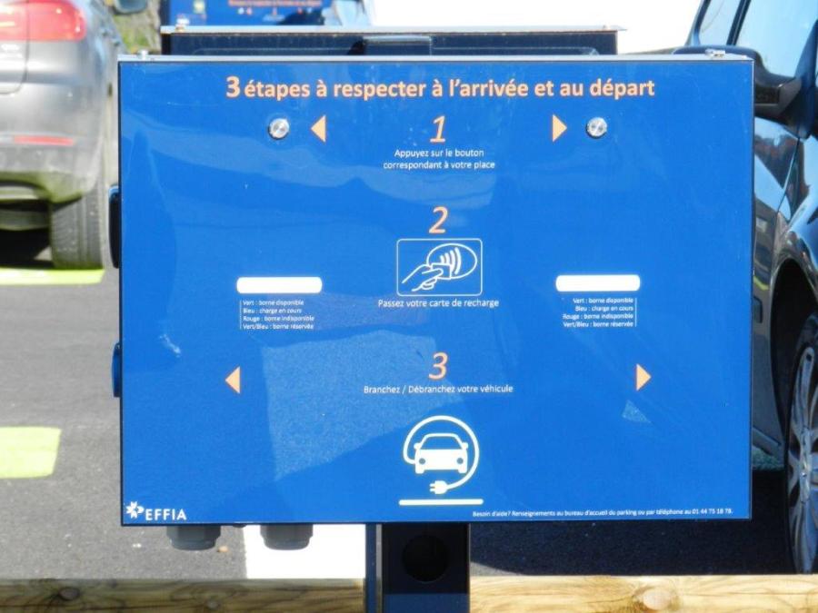 Gros plan sur une des nombreuses bornes de recharge pour batteries de véhicules mus par l’électricité installées sur le parking longue durée P2 de la gare de Nîmes Pont-du-Gard, le mercredi 12 février 2020. Copyright : Anje34