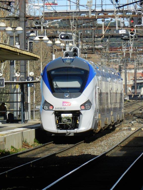 La rame automotrice bimode (électrique et thermique) quadruple caisse B 84699/84700 Régiolis Alstom, assurant le TER 877952 « Le Cévenol », quitte la gare de Nîmes Centre à destination de Clermont-Ferrand en mode thermique, le mercredi 12 février 2020 à 14h18. Copyright : Anje34