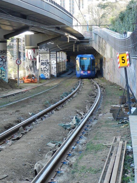 Une rame Citadis 401 Alstom, opérant sur la ligne 1 en direction du terminus « Odysseum », vient de passer sur les rails tout neufs de la voie 1 avant l’entrée de la galerie de la citadelle, le vendredi 14 février 2020. Copyright : Anje34