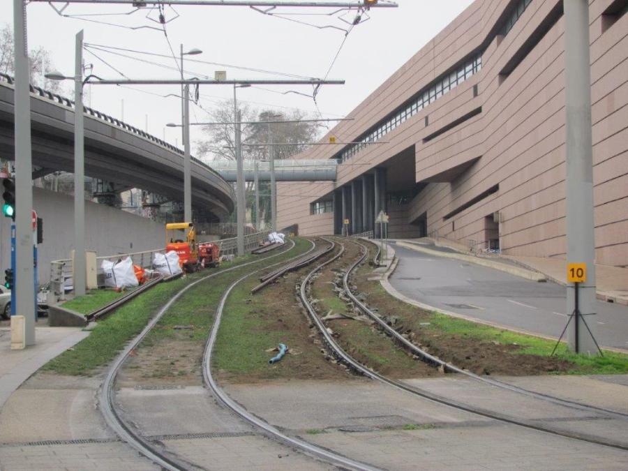Allée de la Citadelle à Montpellier, aperçu de la portion de la plateforme commune aux lignes 1 et 2 où se déroulent les travaux nocturnes de remplacement des rails sur voie 1 (déjà fait), à droite, et voie 2 (reste à faire), à gauche, jusqu’au vendredi 24 février 2020. Photo prise le dimanche 16 février 2020. Copyright : Edouard Paris