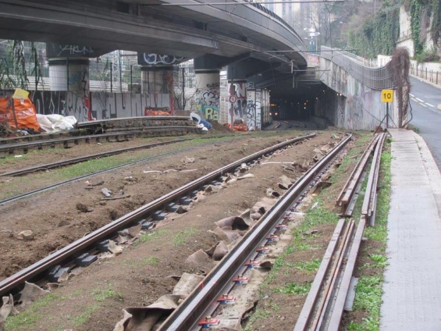 Allée de la Citadelle à Montpellier, sur la droite de la photo prise le dimanche 16 février 2020, des rails neufs destinés à la voie 2, au centre les nouveaux rails soudés de la voie 1 et à gauche de la voie 2 un stock des rails usés remplacés de la voie 1. Copyright : Edouard Paris