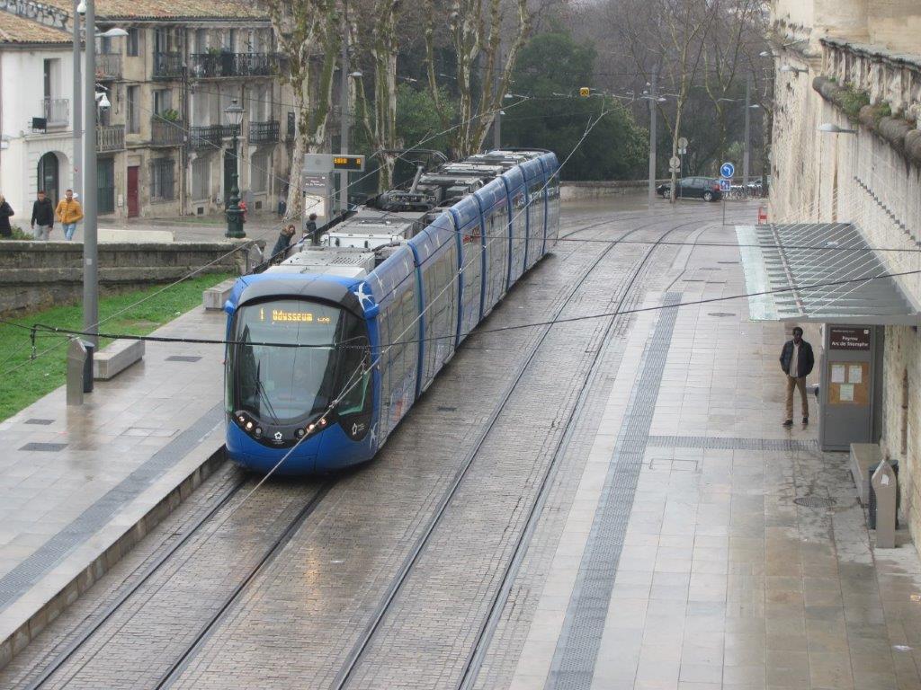 La rame 2091 Citadis 402 Alstom, opérant sur la ligne 1 en direction du terminus « Odysseum », est photographiée à la station « Peyrou – Arc de Triomphe » quai sens b propre à la ligne 4, le dimanche 16 février 2020. Copyright : Edouard Paris