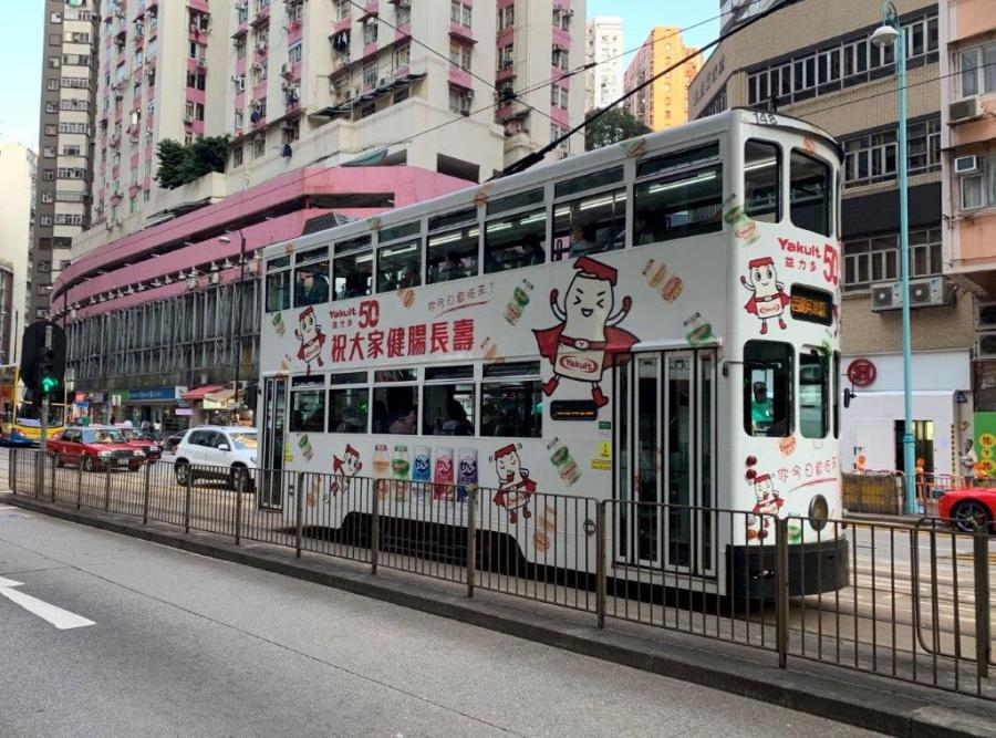 A Hong Kong, livrée Yacult 50 pour la motrice 148 photographiée sur King’s Road à la hauteur du Greenwich Centre, le mardi 18 février 2020. Copyright : DS7