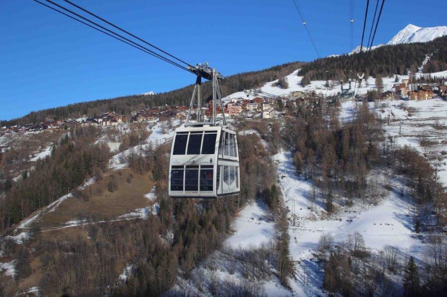 Photographie d’une cabine double niveau du Vanoise Express effectuant la liaison entre la gare motrice de Peisey-Vallandry « Plan Peisey » (1 612 m), au second plan, et la gare de tension de Montchavin « Les Coches » (1 548 m), le vendredi 7 février 2020. Copyright : Marius d’Oriano