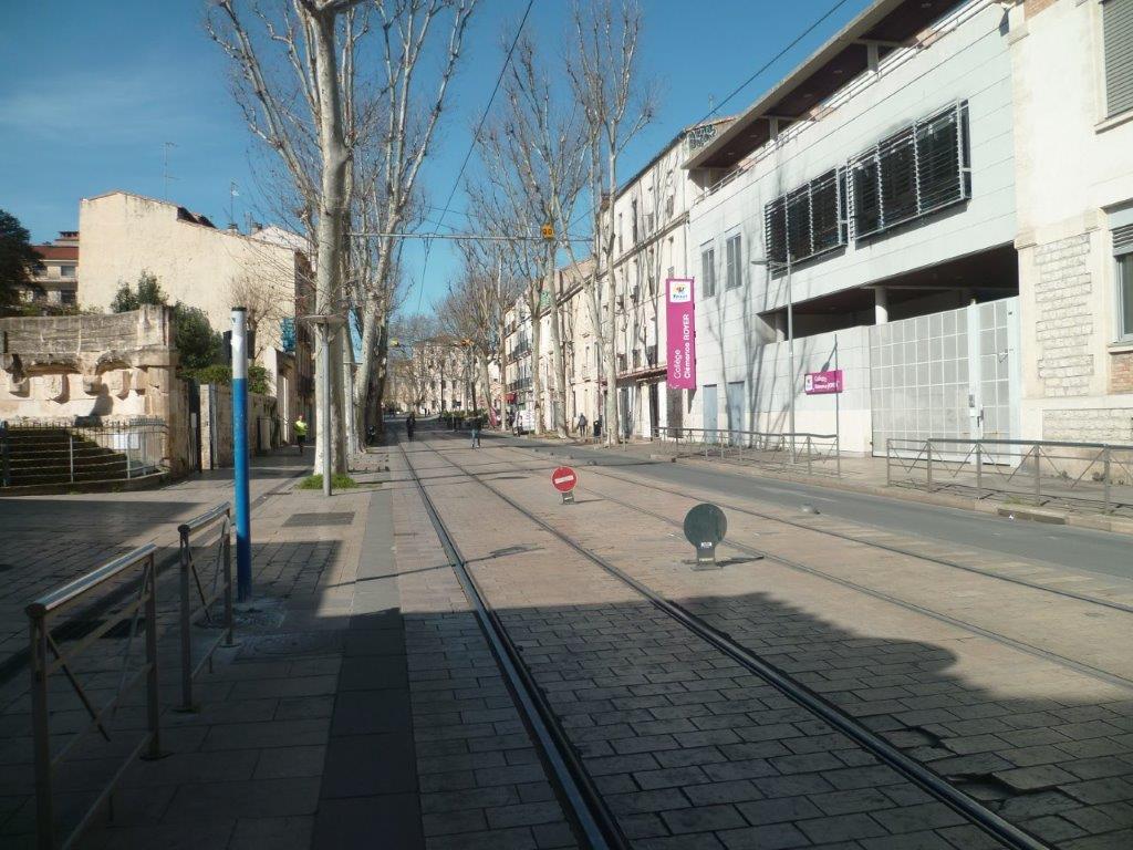 Boulevard Pasteur à Montpellier, autre aperçu de la plateforme commune aux lignes 1 et 4 de tramway dont le revêtement doit être changé en totalité dans le courant de l’été 2020, en principe. Photo prise le samedi 22 février 2020. Copyright : Edouard Paris