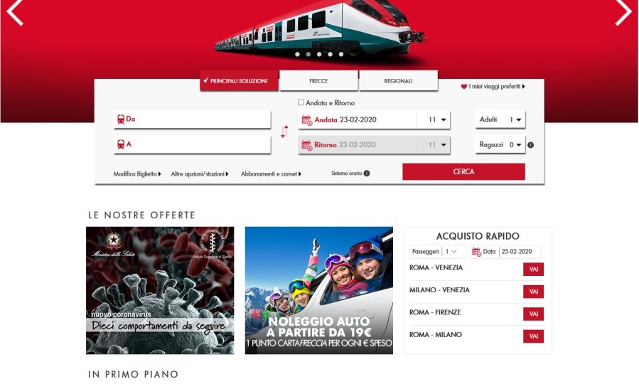 L’image censée représenter le nouveau coronavirus Covid-19, sur laquelle il y a lieu de cliquer pour connaître les dix comportements à tenir, apparaît à la rubrique « Nos offres » en page d’accueil du site trenitalia.it. Capture d’écran réalisée le dimanche 23 février 2020