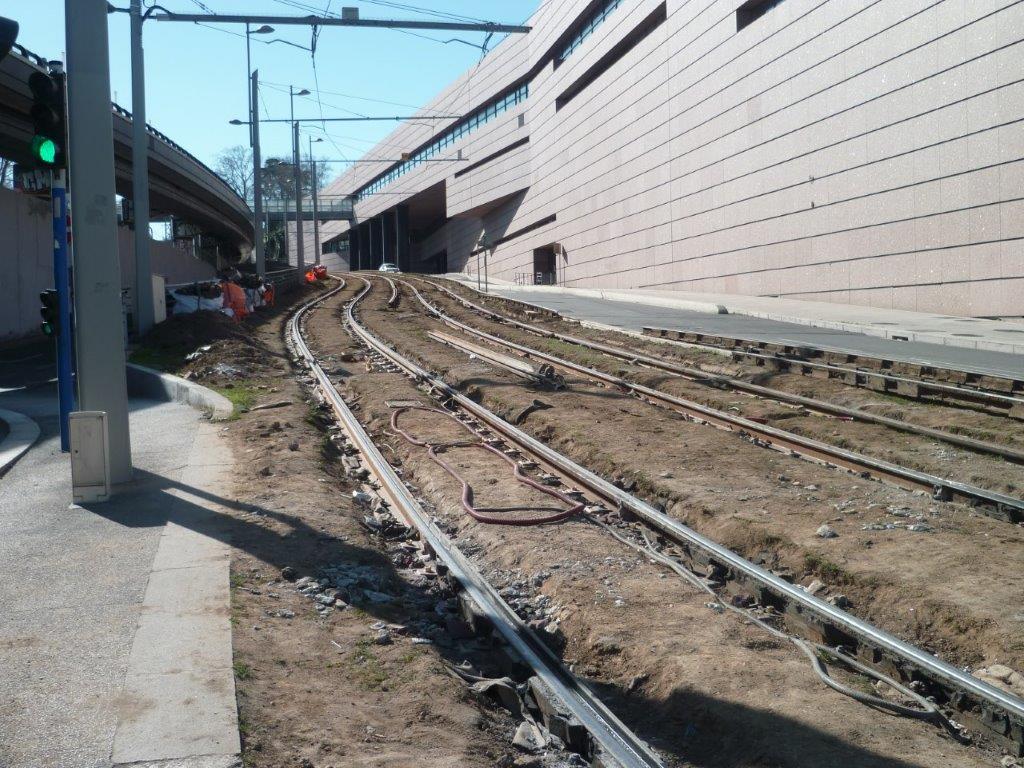 Allée de la Citadelle à Montpellier, aperçu de la plateforme commune aux lignes 1 et 2 de tramway où les rails des deux voies ont été totalement renouvelés. Sur voie 2 on peut distinguer une boucle de détection de passage des rames. Photo prise le samedi 22 février 2020. Copyright : Edouard Paris
