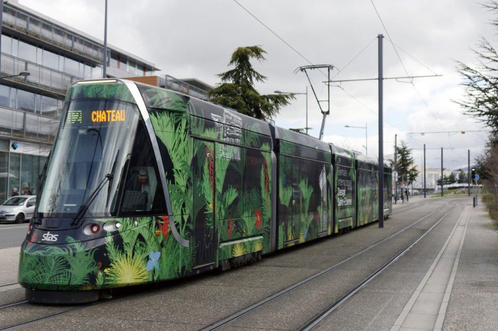 A Saint-Etienne, la rame 948 Urbos 3 CAF revêtue de la livrée « 11e Biennale Internationale Design Saint-Etienne » est photographiée à l’approche de « Châteaucreux Gare » terminus de la ligne T2 et station de la ligne T3, le vendredi 21 février 2020. Copyright : Yvon Brument