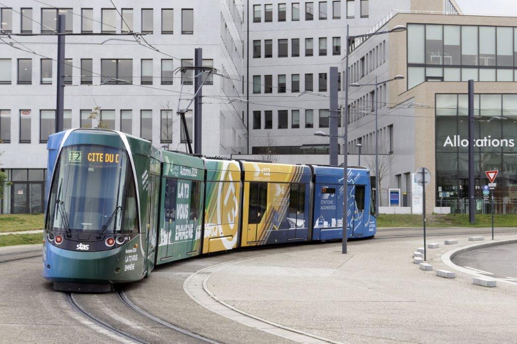 A Saint-Etienne, la rame 954 Urbos 3 CAF revêtue de la livrée « Automne 2019 La T3 vous emmène » , opérant sur la ligne 2 en direction du terminus « Cité du Design », est photographiée dans le virage qui précède la station « Dalgabio » commune aux lignes T2 et T3, le vendredi 21 février 2020. Copyright : Yvon Brument