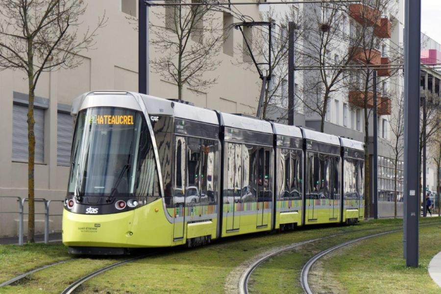 A Saint-Etienne, la rame 951 Urbos 3 CAF, opérant sur la ligne T2 en direction du terminus « Châteaucreux Gare », est photographiée peu de temps après avoir quitté la station « Dalgabio » commune aux lignes T2 et T3, le vendredi 21 février 2020. Copyright : Yvon Brument