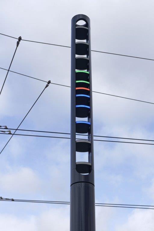 A Saint-Etienne, Aperçu de la partie haute du Sablier de Lumière s’adressant aux utilisateurs de la ligne T3 qui prennent le tramway à la station « Châteaucreux Gare ». Photo prise le vendredi 21 février 2020. Copyright : Yvon Brument