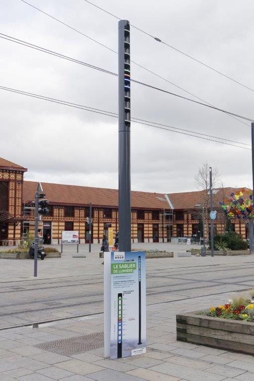 A Saint-Etienne, photographie du Sablier de Lumière s’adressant aux utilisateurs de la ligne T3 qui prennent le tramway à la station « Châteaucreux Gare », le vendredi 21 février 2020. Copyright : Yvon Brument