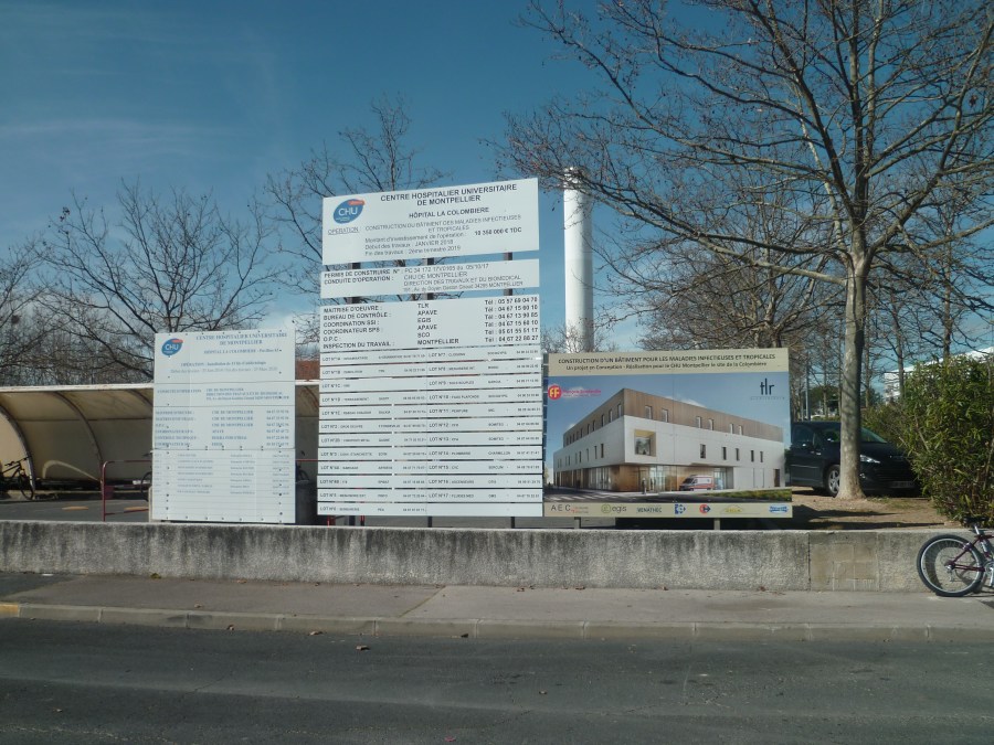 Panneaux installés à l’entrée principale de l’hôpital de la Colombière à Montpellier annonçant la réalisation d’un nouveau bâtiment dédié aux maladies infectieuses et tropicales. Photo prise le vendredi 28 février 2020. Copyright : Edouard Paris