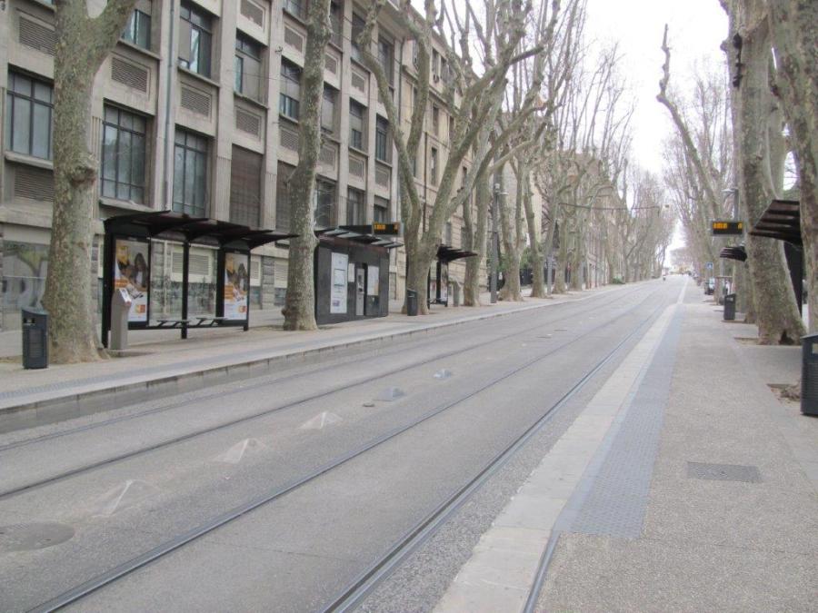 A Montpellier, si l’éventuelle épidémie de coronavirus Covid-19 vient à prendre de l’ampleur dans les jours et semaines à venir, les images de stations de tramway désertes en pleine journée pourraient devenir courantes. Photo de la station « Albert 1er – Cathédrale » de la ligne 4 prise le samedi 29 février 2020 à 14h03. Copyright : Edouard Paris