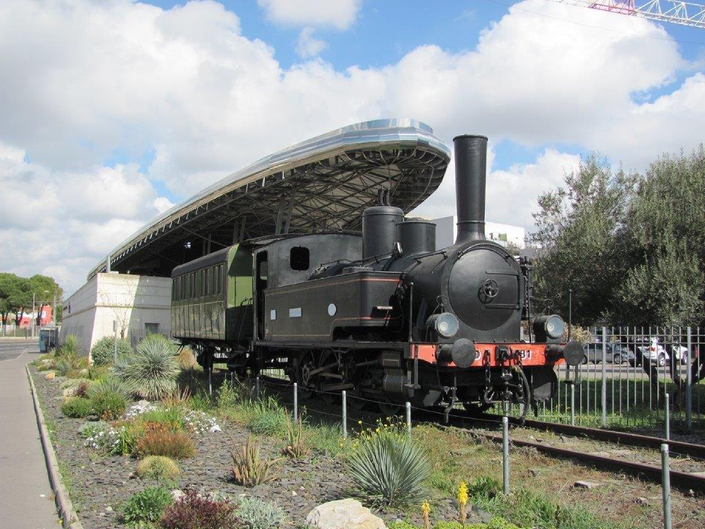 A Montpellier, la locomotive 040T D-81 Schneider (année 1927) et la voiture de 2e classe Cfx 218 (année 1903) du Petit Train de Palavas sont exposées à l’air libre à proximité de la médiathèque Federico Garcia Lorca depuis le samedi 27 janvier 2001. Photo prise le samedi 30 mars 2019. Copyright : Edouard Paris