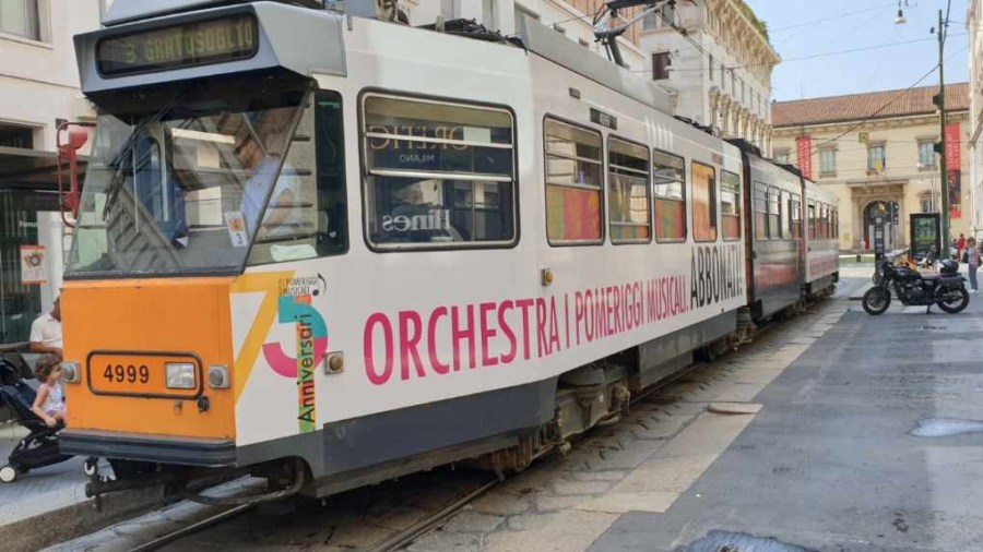 A Milan, Via Cesare Cantù, la rame 4999 de la série 4900 Fiat-Ferroviaria/Stanga (année 1978) est photographiée au terminus en boucle de la ligne 3 « Duomo M1 M3 », le jeudi 29 août 2019. Copyright : Laure C