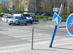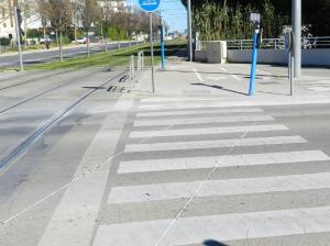 - Photographie du poteau percuté par le museau de la motrice de tête de la rame 2093 Citadis 402 Alstom dont le bogie est sorti des rails à cause d’une collision avec un fourgon utilitaire à l’intersection de l’avenue du Colonel André-Pavelet dit Villars et de l’avenue de Villeneuve-d’Angoulême à Montpellier, le mercredi 11 mars 2020. Copyright : Anje34
