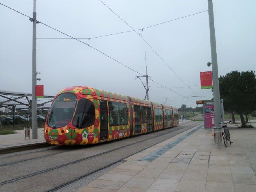 La rame 2050 Citadis 302 Alstom, opérant sur la ligne 2 en direction du terminus « Jacou », est photographiée à la station « Georges Pompidou » à Castelnau-le-Lez, le jeudi 12 mars 2020. Cette station dessert le lycée éponyme obligé de fermé du jeudi 12 au mercredi 25 mars 2020 inclus à la suite de la publication d’un arrêté préfectoral en date du mercredi 11 mars 2020. Copyright : Edouard Paris