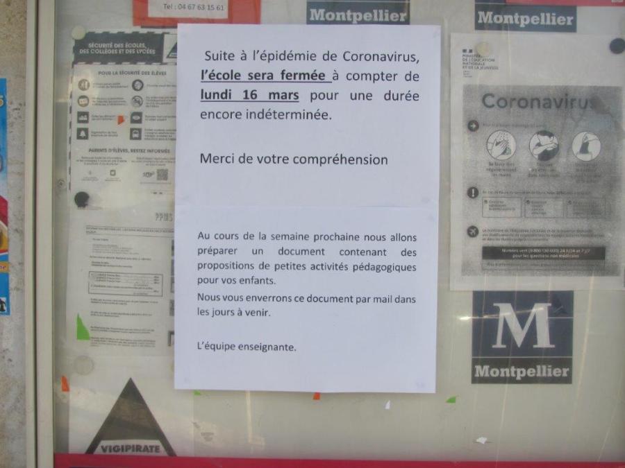Note d’information en lien avec l’épidémie de coronavirus Covid-19 s’adressant aux parents des élèves de l’Ecole maternelle Mozart à Montpellier, avenue d’Assas, photographiée le vendredi 13 mars 2020. Copyright : Edouard Paris
