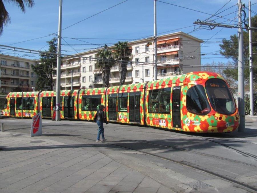La rame 2052 Citadis 302 Alstom, opérant sur la ligne 2 en direction de « Sabines », est photographiée sur la place du 11 Novembre à Montpellier, le vendredi 13 mars 2020, quelques secondes après avoir quitté la station « Corum ». Copyright : Edouard Paris