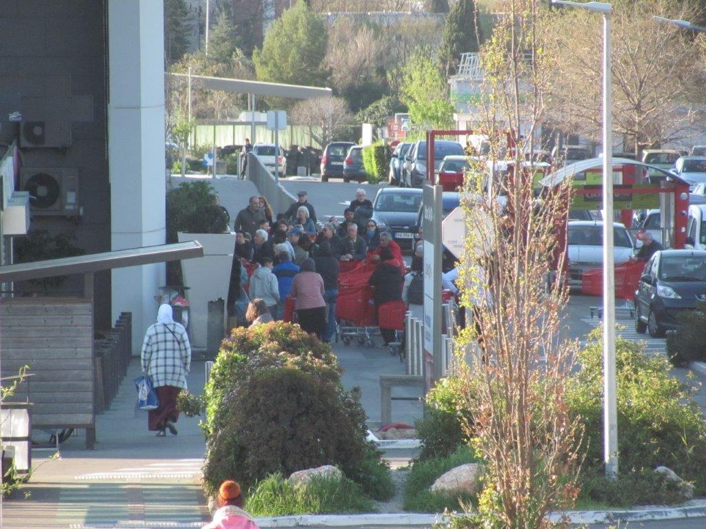Deux minutes avant l’ouverture des portes, beaucoup de personnes, caddies en main, étaient massées devant l’entrée principale du Géant Casino Celleneuve à Montpellier, le samedi 14 mars 2020 à 8h28. La distance de sécurité d’au moins un mètre préconisée pour ralentir la diffusion du coronavirus Covid-19 n’était absolument pas respectée. Copyright : Edouard Pars
