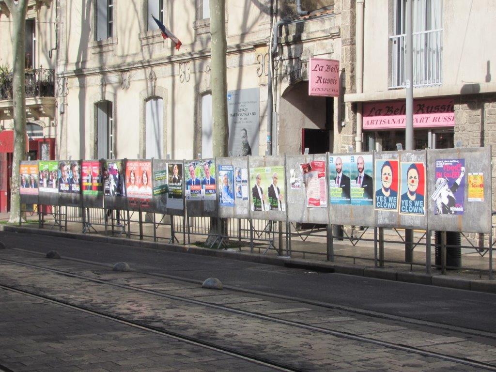 Boulevard Louis-Blanc, photographie, le vendredi 13 mars 2020, des panneaux électoraux des quatorze listes en lice au premier tour des élections municipales à Montpellier. La moyenne d’âge des colistiers est la plus élevée chez le maire sortant. Copyright : Edouard Paris