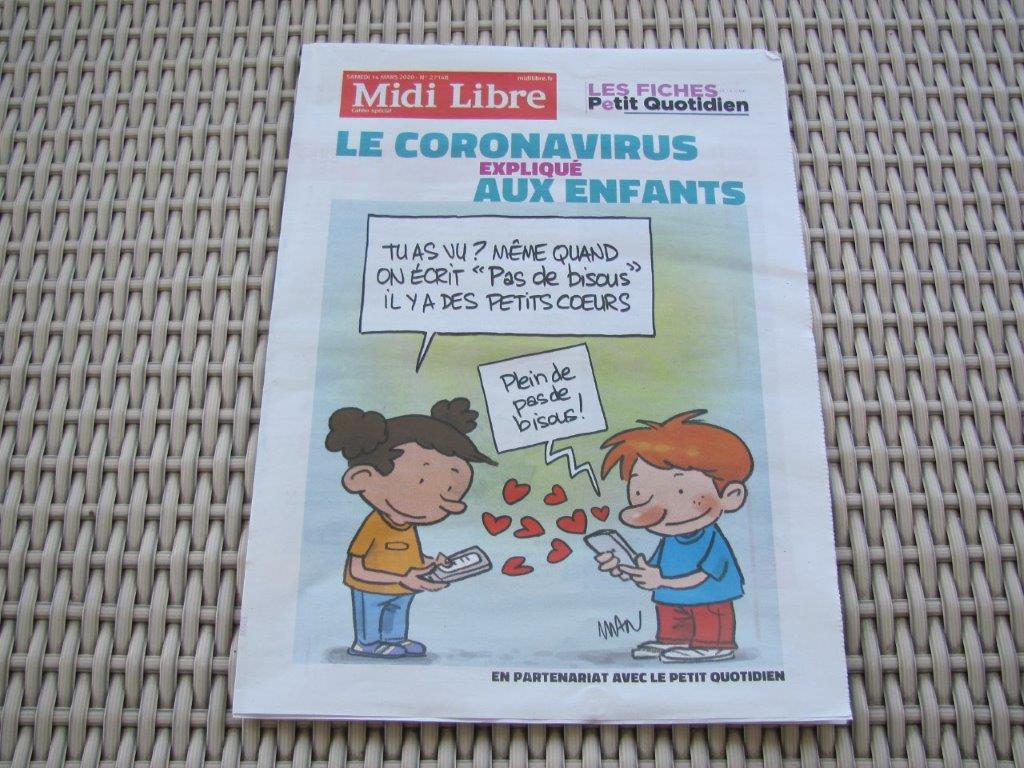 Supplément du quotidien régional Midi Libre rattaché au journal du samedi 14 mars 2020, intitulé « Le coronavirus expliqué aux enfants ». Copyright : Edouard Paris
