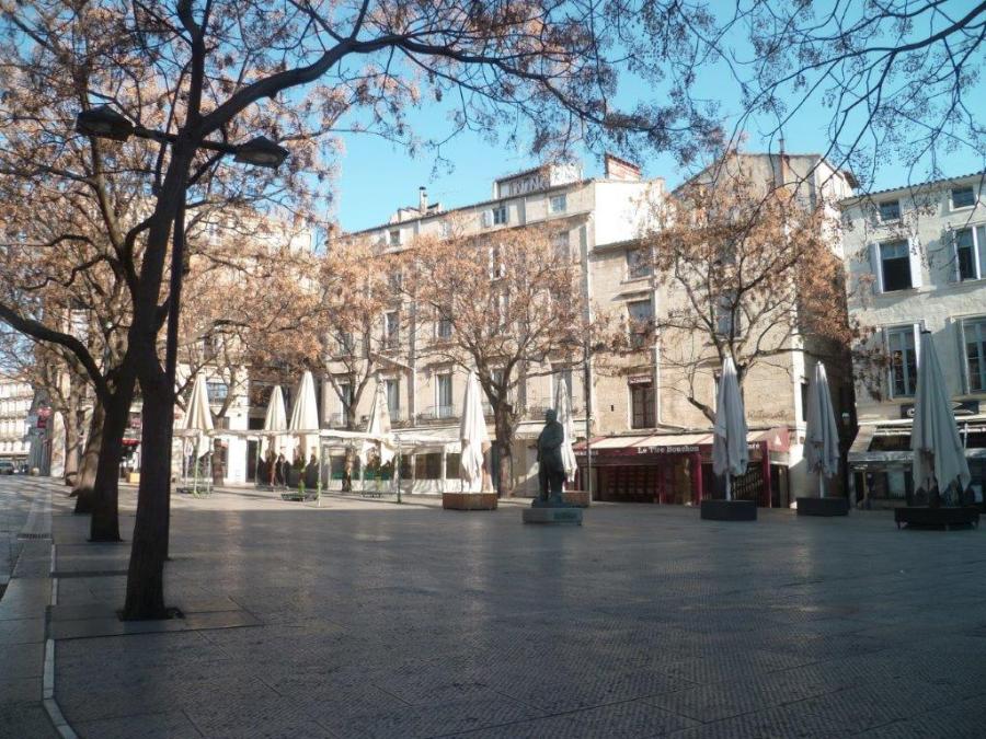 Photographie de la place Jean-Jaurès à Montpellier, le dimanche 15 mars 2020, au lendemain de l’annonce faite par le Premier ministre de fermer jusqu’à nouvel ordre tous les lieux recevant du public non indispensables comme les restaurants, cafés, cinémas et discothèques à compter du samedi 14 mars minuit épidémie de Covid-19 oblige. Copyright : Edouard Paris