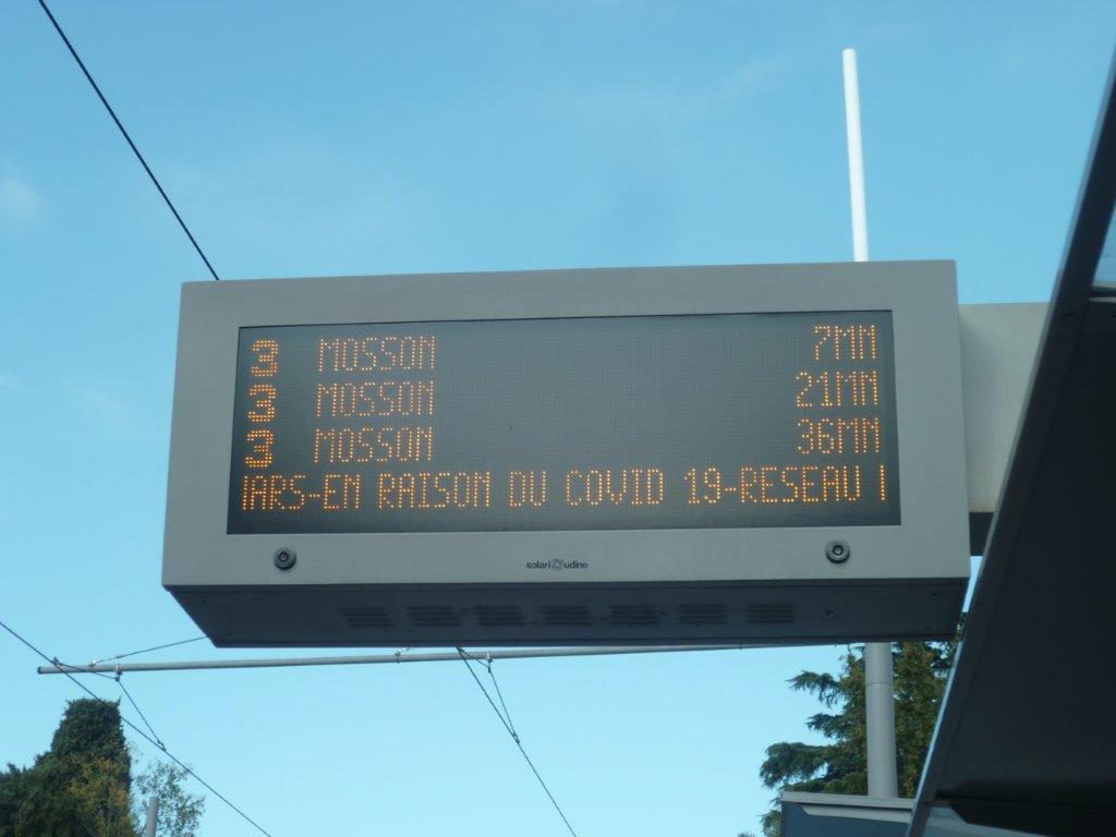 Photographie du tableau électronique d’information de la station « Les Arceaux » de la ligne 3, quai direction « Juvignac », le dimanche 15 mars 2020, où il est question du Covid-19 en message défilant. Copyright : Edouard Paris