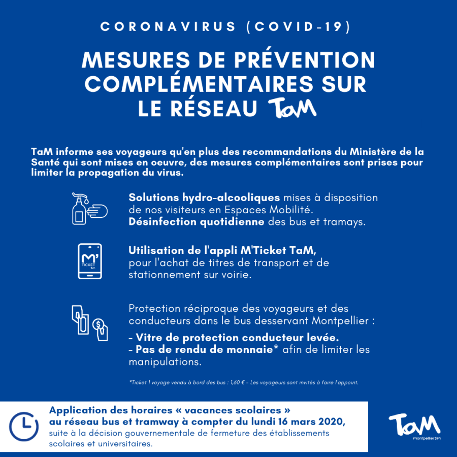 Document mis en ligne par TaM Montpellier 3M sur son site internet à la rubrique « Actualités », sa page Facebook et son compte Twitter, le vendredi 13 mars 2020