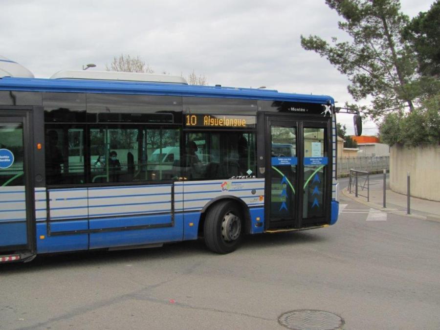 Epidémie de Covid-19 oblige, depuis le lundi 16 mars 2020, la clientèle de TaM Montpellier 3M ne peut plus monter jusqu’à nouvel ordre par la porte à double vantail située à l’avant d’un bus et doit par conséquent accéder à l’intérieur du véhicule par la porte à double vantail dédiée à la descente. Copyright : Edouard Paris